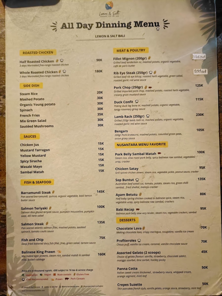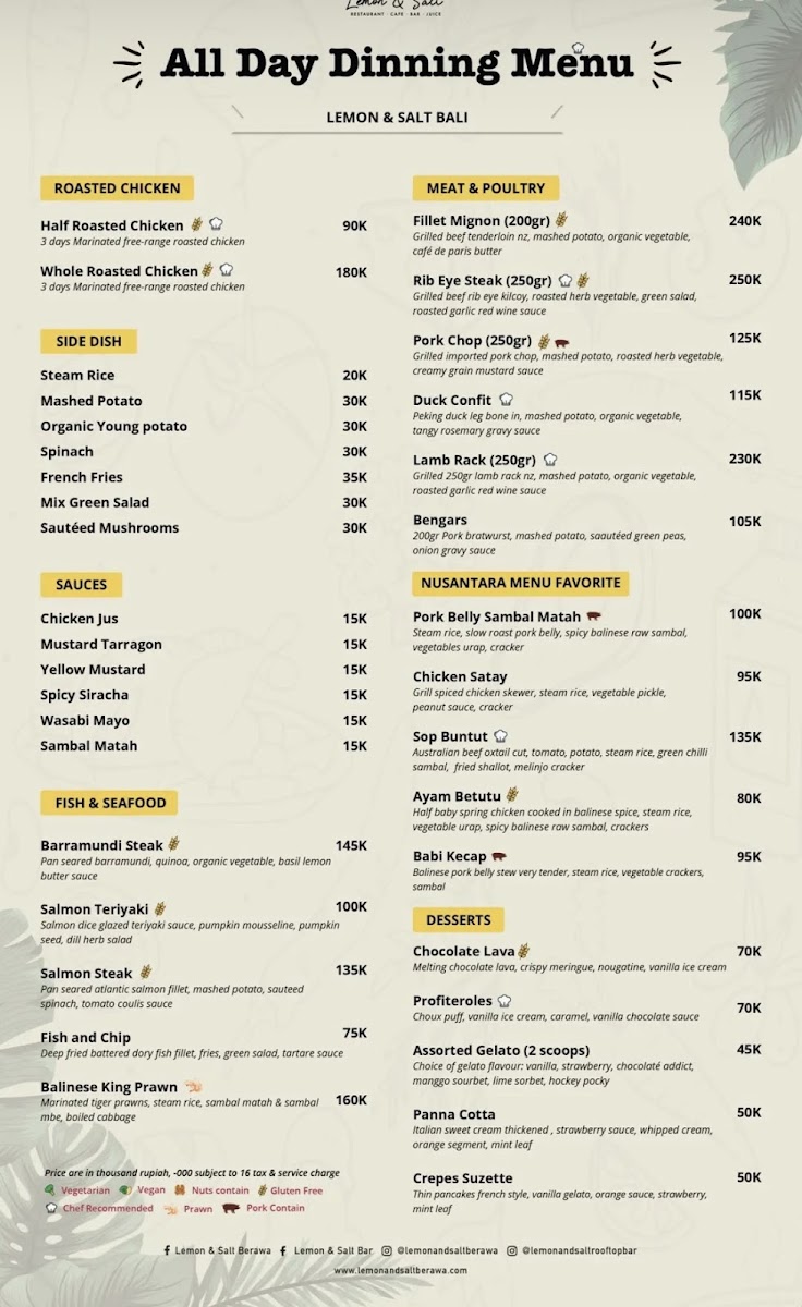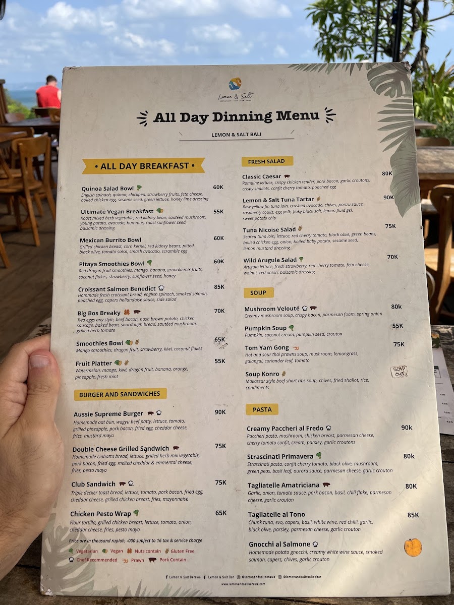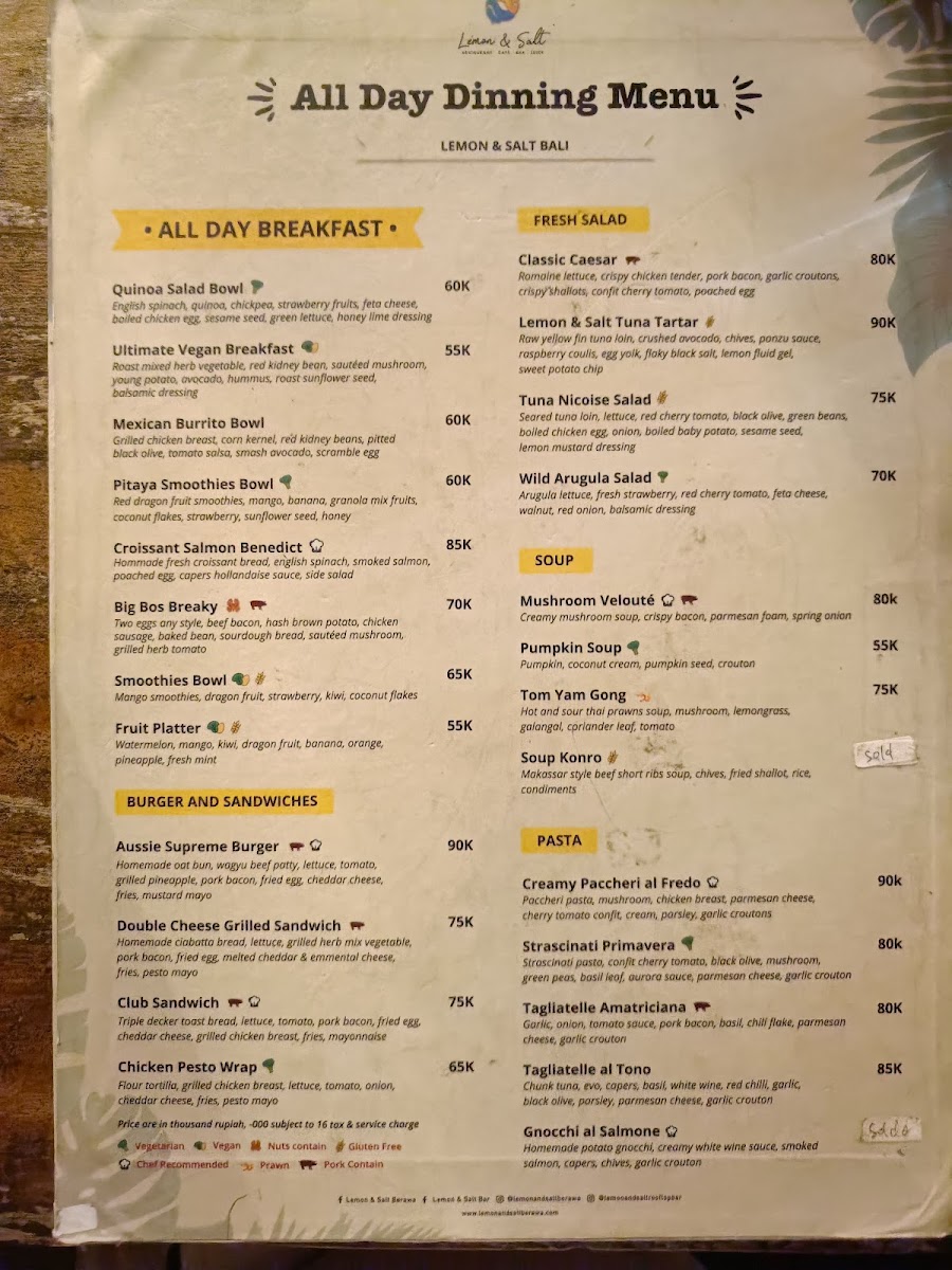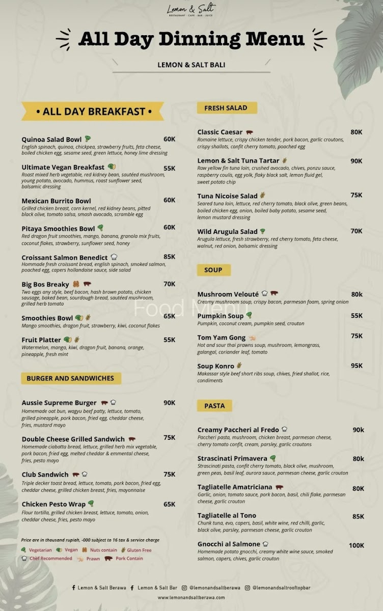 The menu at Lemon & Salt offers a delightful mix of healthy and flavorful dishes that reflect the vibrant tastes of Bali. For those looking to kickstart their day with a refreshing and nutritious option, the Detox Juice stands out as a rejuvenating choice. It’s packed with fresh ingredients that cleanse and energize, making it a perfect choice for anyone in need of a revitalizing start. The restaurant also features a variety of well-prepared salads and smoothies, offering both vegetarian and vegan options that cater to different dietary preferences. Whether you're craving something light or more indulgent, the menu balances both with its carefully curated selections. Each dish is thoughtfully crafted, combining local flavors with international influences, ensuring that there is something for everyone.